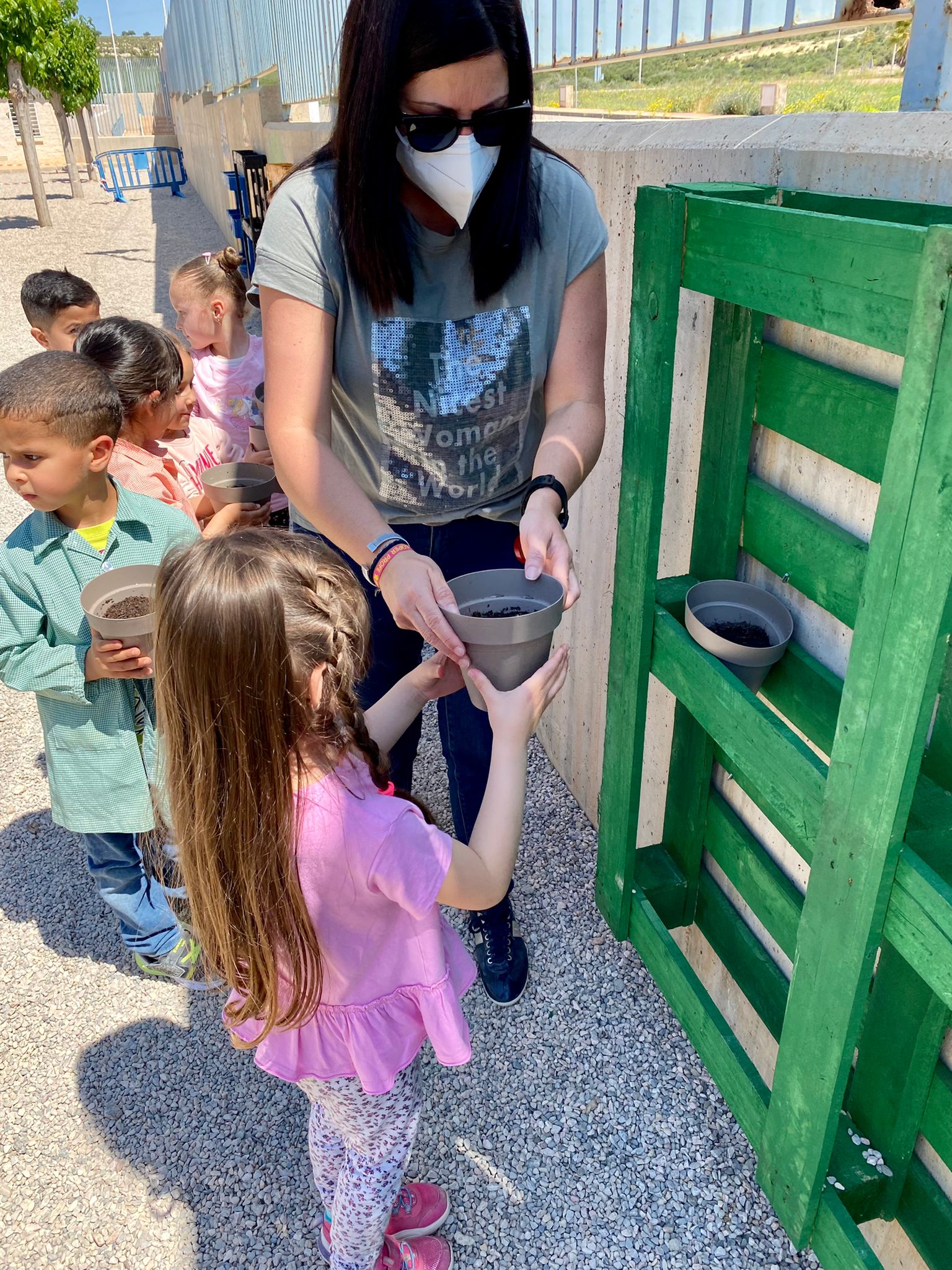 A lo largo del 3º trimestre, construimos en el patio de infantil un huerto vertical hecho con palets en el que pusimos unas macetas que previamente plantamos y que las cuidamos y las llevamos a casa a final del trimestre, cuando ya estaban creciendo.